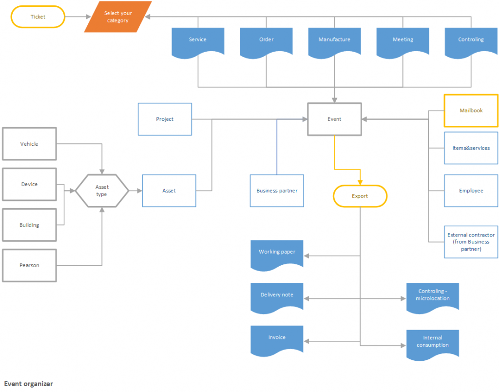 Each task can be related to the facility (device, vehicle, machine, ...) and is defined by data such as: priority, deadline, estimated time of repair, estimated exchange of goods, planned billing services and comments with correspondence between